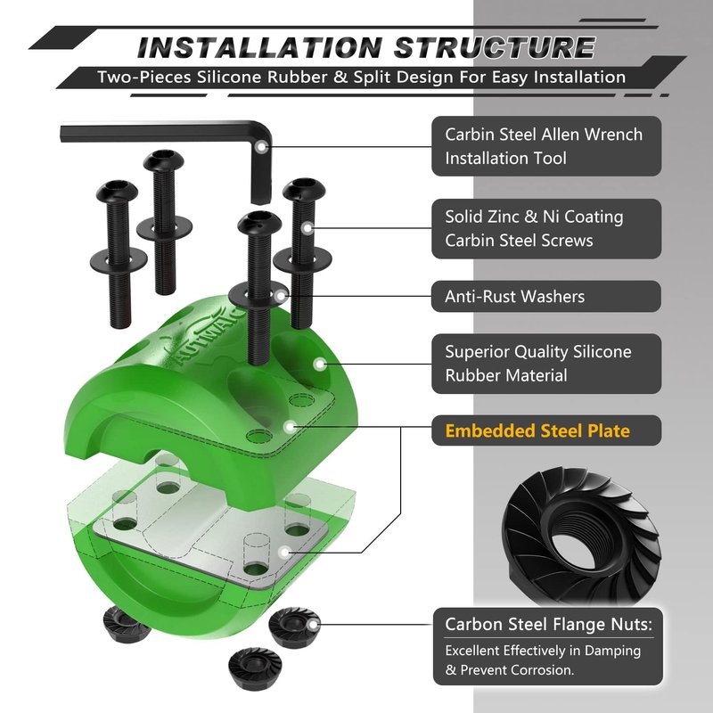 - Fitted Suite: Two-Pieces Silicone Rubber Design with Four Solid Carbon Steel Bolts, Four Locking Nuts and Four Washers Add a Portable Allen Wrench Tool, Split Design for Easy Installation. All of These Accessories Surface Covered By Zinc & Ni