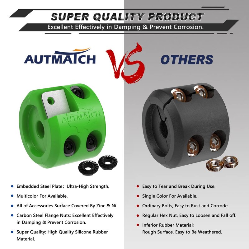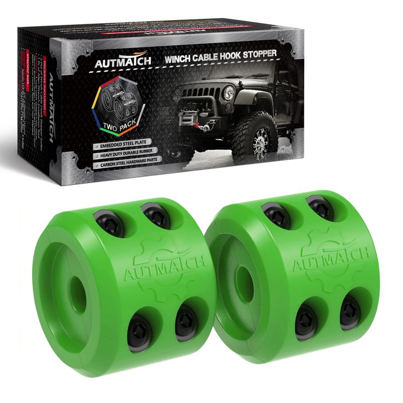 AUTMATCH Pack of 2 Winch Cable Hook Stopper Silicone Rubber Shock Absorbent Winch Stopper Best Winch Accessories for Wire & Synthetic Cables ATV UTV Accessories Prevent Pulling Materials: Heavy Duty Silicone Rubber Central Hole Size: 1/2" In Diameter (12mm) Overall Dimension: 2.44 x 2.44 x 1.88 Inches (6.2 X 6.2 X 4.77CM) Weight: 14.8 Oz ( 420g) / Box, (1 Box = 2 Suites) Multicolor For Available: Black, Red, Orange, Green, Yellow, Etc *You Can Mix and Match The Colors ( Half & Half) and See For Yourself. The Results Will Surely Astonish You, Such As: Black & Red, Black & Orange, Yellow & Black, Red & Green, Green & Yellow Etc Package Included: * 2 Pcs of Winch Cable Hook Stopper Suites * 1 Pc of Allen Wrench Installation Tool * Remark: 1 Suite Cable Stopper=Two-Pieces Rubber Design + Four Solid Carbon Steel Bolts+ Four Locking Nuts and Four Washers Please protect your hands with epithelial gloves when installing: *Step 1: Freespool Winch and Pull Out The Approx 2 Feet of Cable. *Step 2: Connect The Two Halves of The Split-Up Together, Place The Cable or Rope Between Two Halves, Insert Four Bolts and Tighten Them, So That The Two Parts are Connected Together. *Step 3: Re-Attach The Hook To Cable End. To Stow Hook, Engage Clutch And Retract Cable Onto Winch Spool Until Hook Is Snug Against The Hook Stopper And Fairlead. *Step 4: Position Hook Stopper at Approx. 3/4 Of The Total Line Distance Towards Hook While Using You Winch. Tips: Our Products' Pictures Are Real And Shot By Professionals. However, Due To Differences In Computer Monitors Display, There Can Be Color Variations Between The Actual Product And Your Screen We're Committed To Creating Great Products Backed By Friendly, Responsive Service To Delight Our Loyal Customers Around The World.