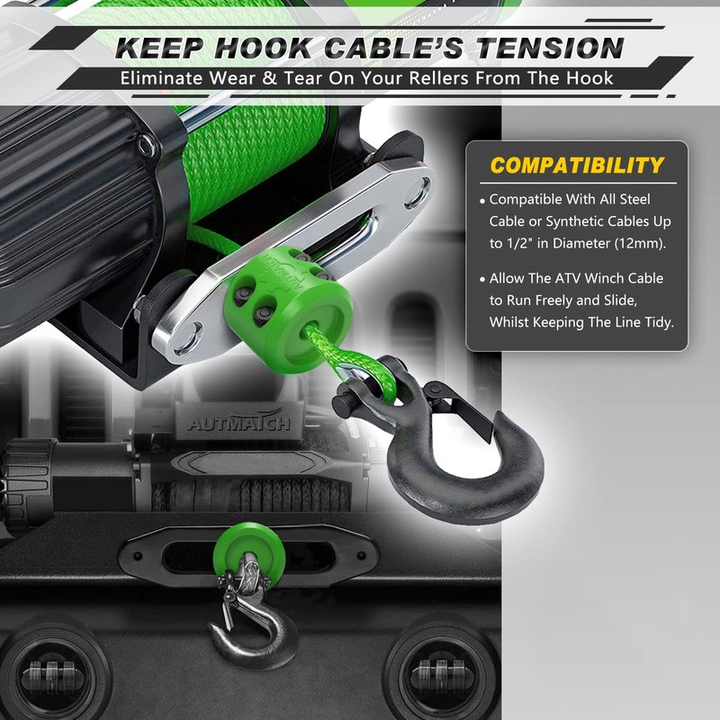 - Compatibility: Compatible With All Steel Cable or Synthetic Cables Up to 1/2" in Diameter (12mm). Allow The ATV Winch Cable to Run Freely and Slide, Whilst Keeping The Line Tidy. Protect Your Winching Gear Like Never Before. For Trucks, ATV, UTV, ORV, Trailers, and Sport-Utility Vehicles Etc