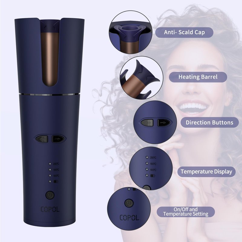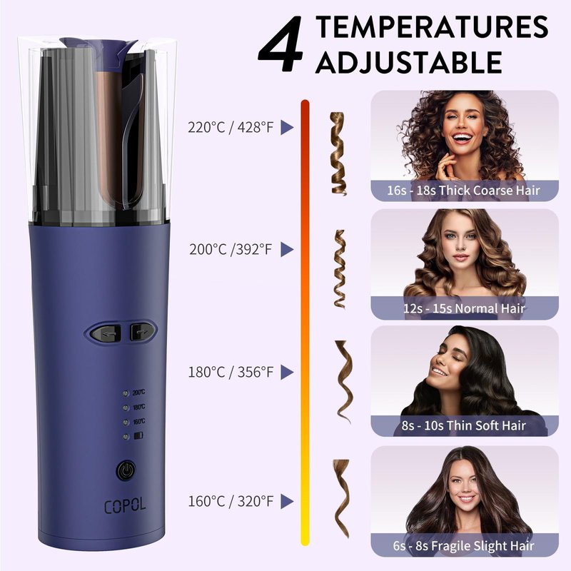 - Automatic Curling Iron with 3 Temps - The automatic curling iron uses a negative ion generator to keep hair moisturized and bouncy and comes with 3 adjustable temperature levels. The temperature range is 160 degrees Celsius/180 degrees Celsius/200 degrees Celsius for different hair types. This curling iron heats up quickly in 30 seconds and curls your hair as you wish, making your hair's beauty last all day long