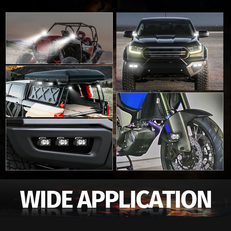 - WIDE APPLICATION - The compact housing design offers endless possibilities in terms of mounting locations. Widely fit for Motorcycles, Power Sports, ATVs, UTVs, RZR, Can-am, Off Road Vehicles, SUV, Trucks, Pickup, GMC, Ram, Tractors, Boats, Snowmobile, lawn-mower, golf cart etc. Many indoor and outdoor uses: Garden Lighting, Backyard Lighting, Back-up Light, Construction Lighting and so on. Working voltage of DC 12-30V.