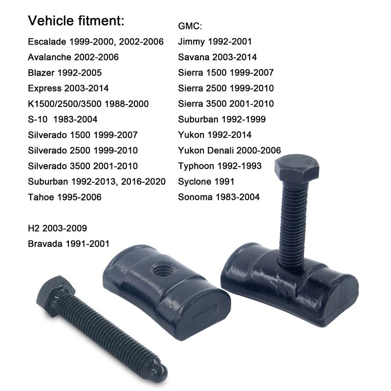 - Torsion bar adjusting blocks also fit 1999-2010 Sirra 1500/2500/3500, 1992-2001 Jimmy, 1983-1991 S15, 2003-2014 Savana, 1991-2004 Sonoma, 1992-2014 Yukon, 2003-2009 H2, 1999-2006 Escalade and 1991-2001 Bravada