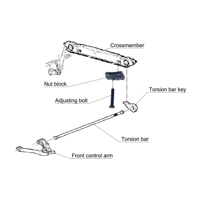 - Forged torsion bar key adjuster nuts and bolts with black anti-rust coating, the high tensile grade 12.9 torsion bar key adjuster bolts are a grade stronger than the OEM bolts, M12 and 2.85" in length with 22mm hex head, Full threaded offers a wider range of adjustment