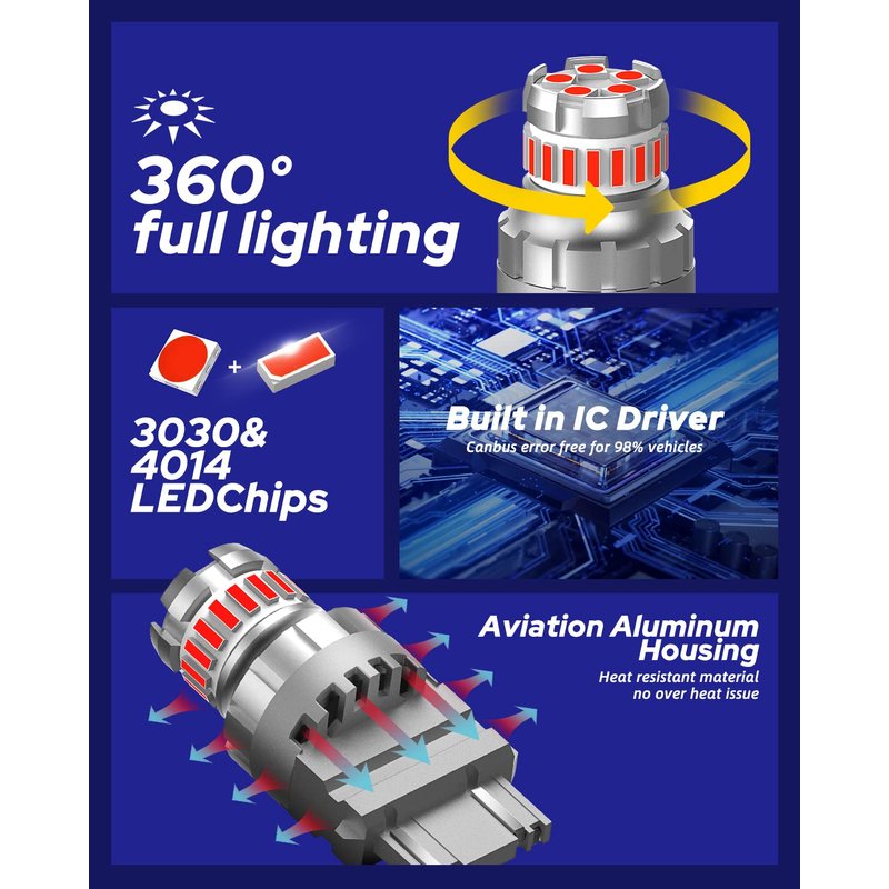 - ULTRA BRIGHT: AUTOONE 3157 red led bulbs utilize newest powerful and high quality 4014 & 3030SMD led chips, 360°illumination, generating 300% brighter output than halogen. Ensure sufficient illumination brightness and distance, the warning effect is more obvious.