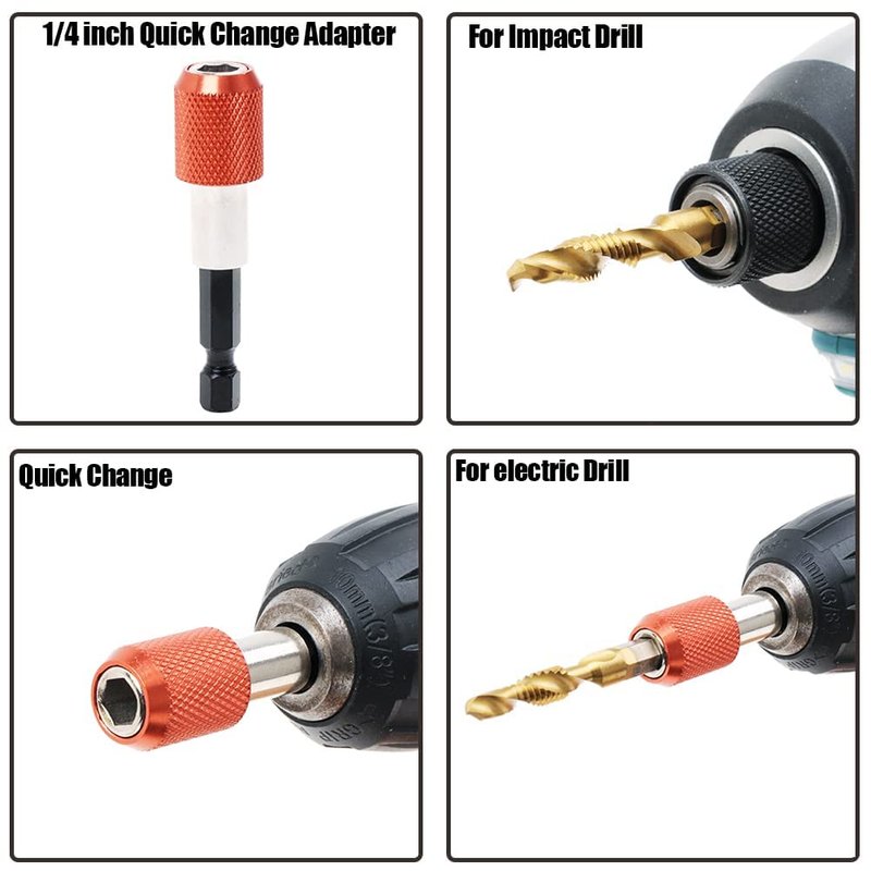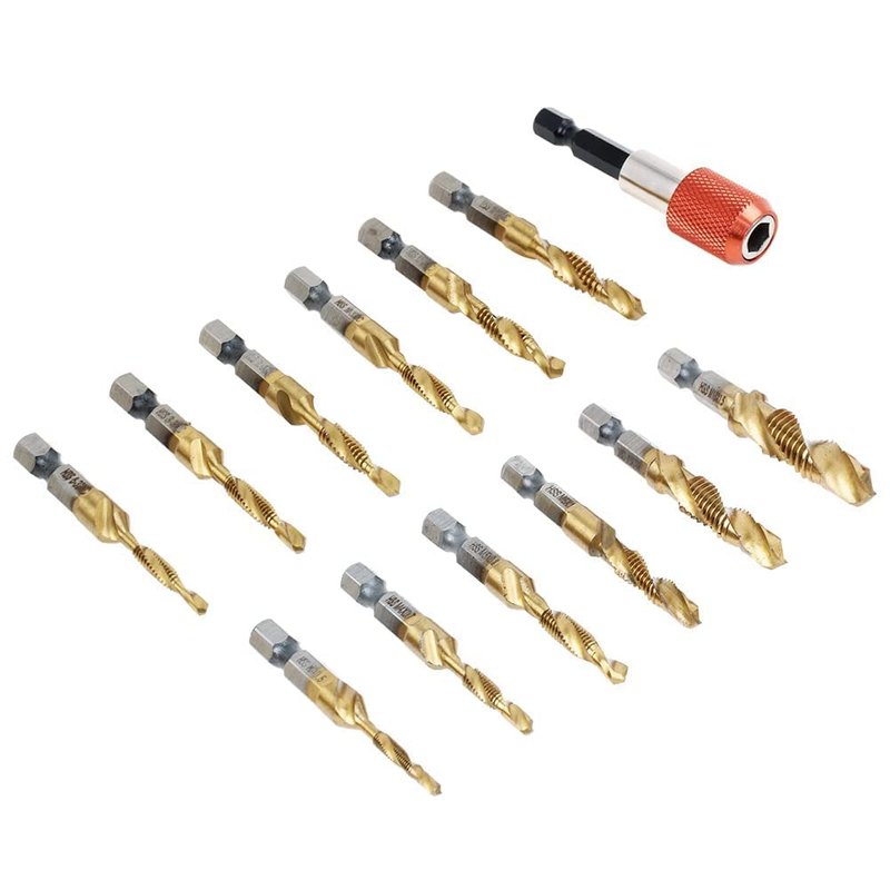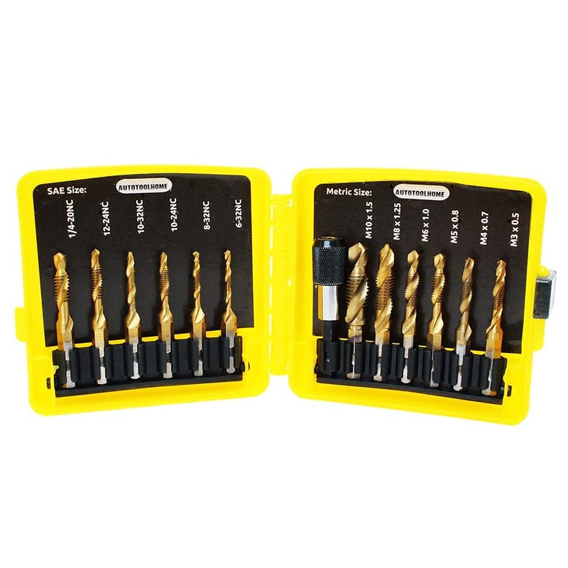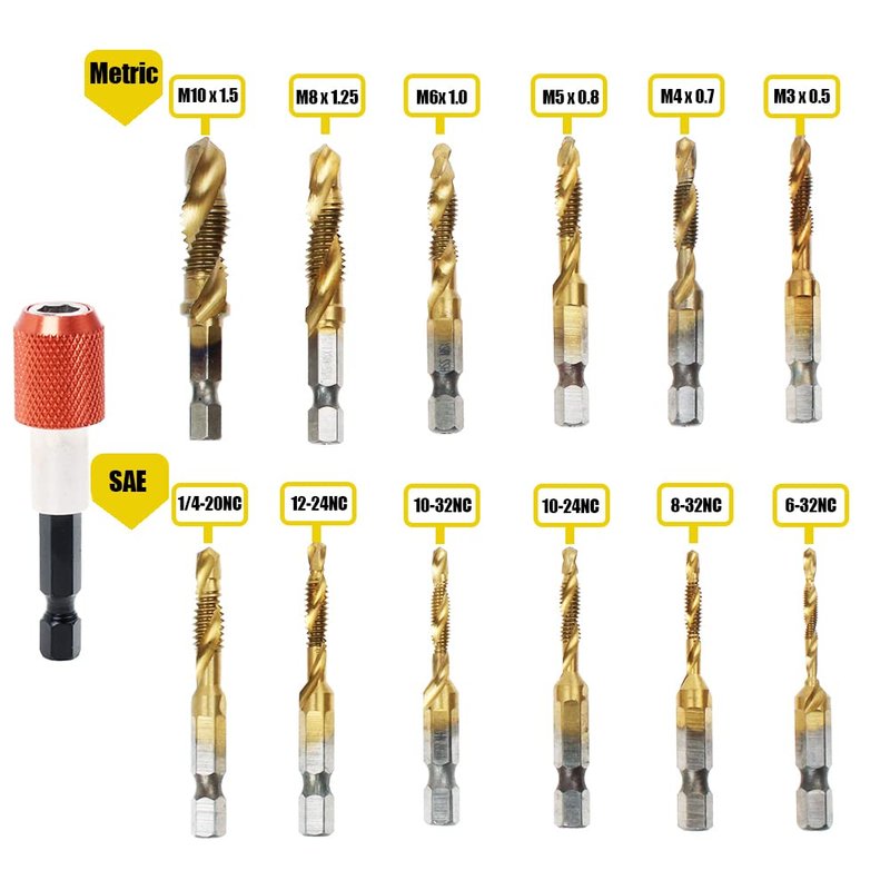 - 13pcs drill tap kit include SAE and metric sizes, Suitable for most commonly used screw tapping.SAE Included 6-32NC, 8-32NC, 10-24NC, 10-32NC, 12-24NC and 1/4-20NC,Metric included M3 x 0.5, M4 x 0.7, M5 x 0.8, M6 x 1.0, M8 x 1.25, M10 x 1.5 , Includes storage case and quick change adapter for easy bit switching