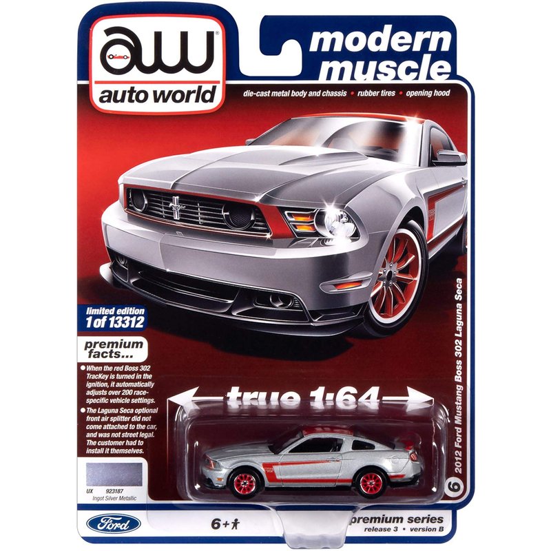 Autoworld 1/64 diecast Model of 2012 Ford Mustang Boss 302 Laguna Seca Ingot Silver Metallic and Red with Red Wheels Ltd Ed 13312 pcs 64262-AWSP046 B
