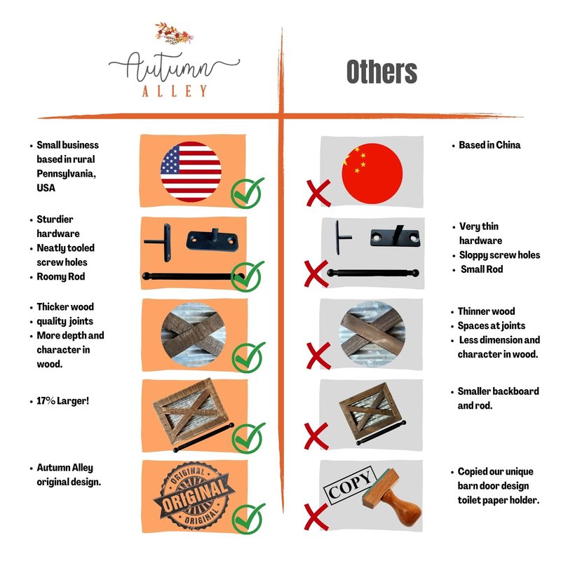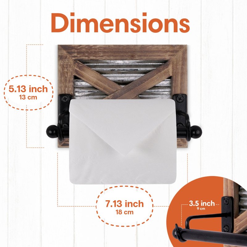 AUTUMN ALLEY FARMHOUSE TOILET PAPER HOLDER The Autumn Alley Rustic Barn Door themed Toilet Paper Holder is an exceptionally functional and timeless piece of western bathroom decor that will make a great addition to your home. CHARM IS IN THE DETAILS -Finished in warm brown wood, this farm toilet paper holder adds the rustic charm into your home without overpowering it -Galvanized corrugated metal sheet and black metal brackets enhance the appeal of this country toilet paper holder -Barn door motif and weathered wood accentuate the countryside feel of this rustic paper roll holder naturally -Perfect size of 6.25 in x 5 in x 3.5 in is not only ideal for holding toilet paper rolls but even from aesthetic point of view STURDY & DURABLE BUILD -Rustic farm bathroom accessories do not need to have corroded surfaces, sharp corners or flimsier build -Designed using solid wood, high quality sturdy metal sheet which is resistant to rust/corrosion, and black metallic brackets & crossbars which add a contemporary element to design, our old-fashioned toilet paper holder can help reinvent your décor -World-class craftsmanship that reflects in every piece of this country bathroom hardware