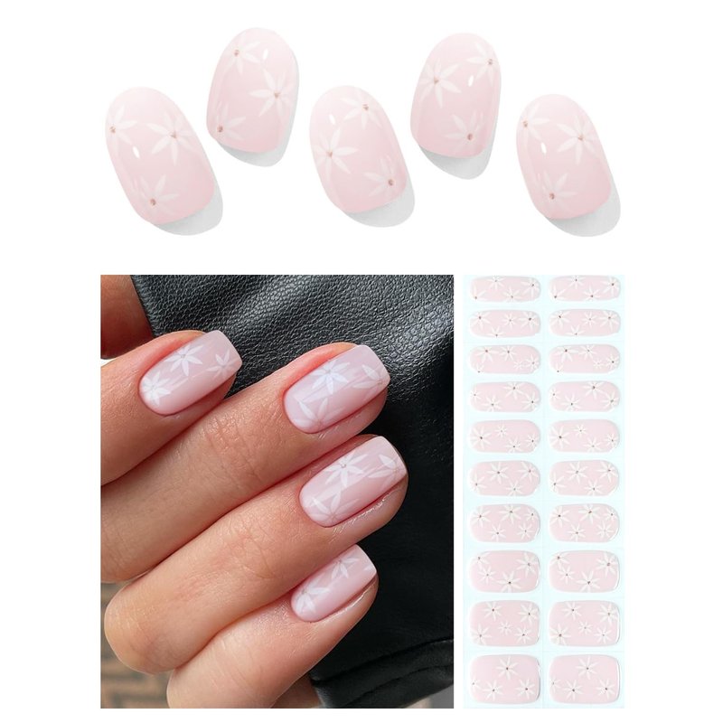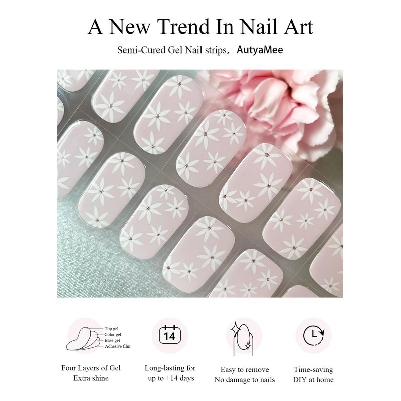 AutyaMee Semi Cured Gel Nail Strips (Pink & White Flower)-20 PCS Summer Gel Nail Stickers | UV Light Required | Gel Nail Wraps, Salon Quality & Easy to Use