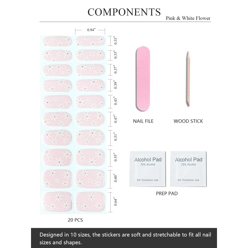 - 【Complete Set of Nail Art Stickers】- Each box includes 20 easy to use semi cured gel nail wrap in 10 different sizes. It also comes with 2 prep pads, 1 nail file, and 1 wooden stick.