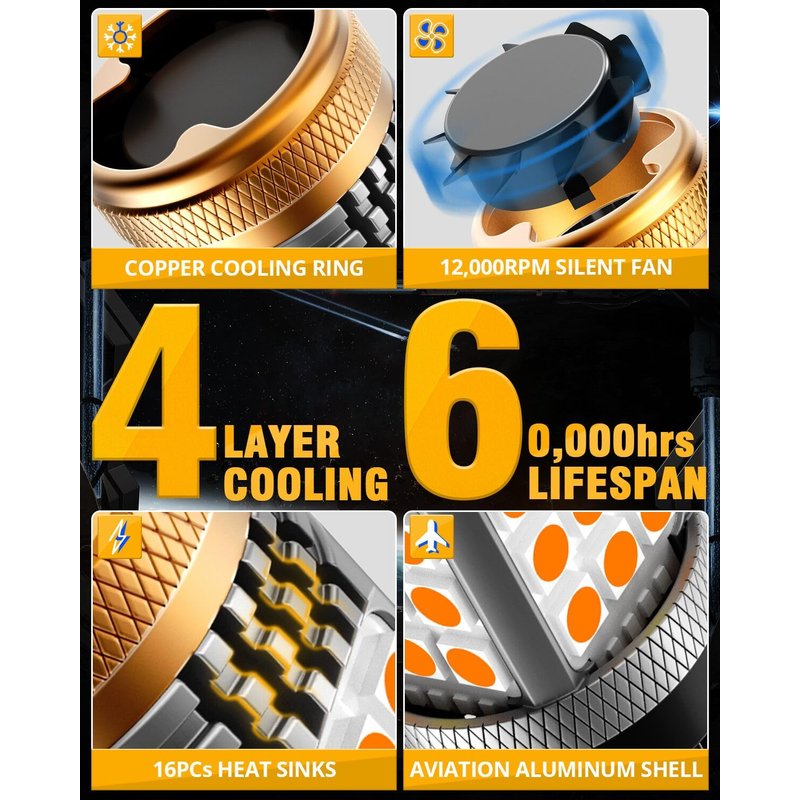 - 🏆【4-LAYER COOLING SYSTEM】IP68 waterproof and dustproof. The built-in 2023 stable current IC driver avoids digital or VHF radio signal interference. The 2023 latest cooling system - 12,000RPM silent fan + Copper cooling ring + 16PCs heat sinks + 6063 aviation aluminum lamp body directly doubles heat dissipation, ensuring longer lifespan up to 60,000 hours.