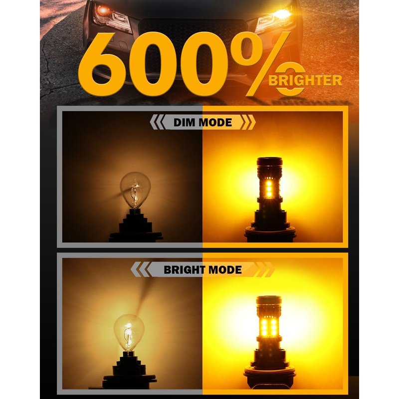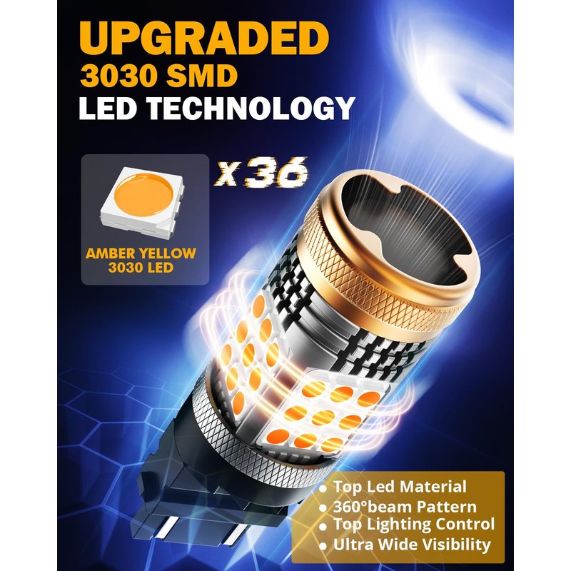 - 🏆【600% EXTREMELY BRIGHT】Sequencing 36PCs Upgraded high brightness 3030 SMD chips precisely around each 3157 led bulb, 28W per bulb, High Power and 600% brighter, providing 3500K Amber Yellow light for turn signals. Stronger light penetration output for 40% more visibility than ordinary leds. Instant-on response without warm-up time, 360° illumination without dark spot, brighter and safer when turning.