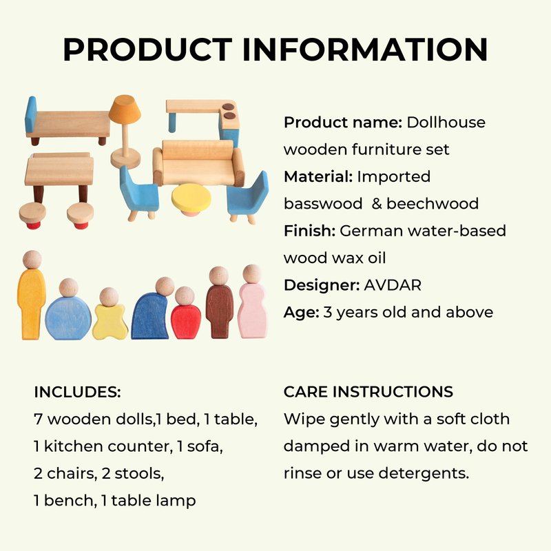 - EXCELLENT DOLLHOUSE FURNITURE: This 18 pieces wooden furniture and doll set will transform a Twirl Around Dollhouse or any other house-style playset into a cozy, inviting space. The set features cute, vivid accessories, including 7 carefully handcrafted people figures and 11 furniture pieces for different rooms: 1 bed, 1 table, 1 kitchen counter, 1 sofa, 2 chairs, 2 stools, and 1 bench. The soft colors and simple forms allow for different combinations and variations in setting up the space.