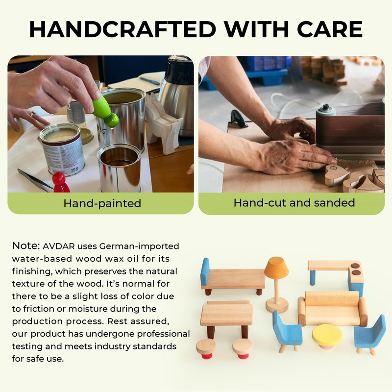 - CRAFTED WITH ATTENTION TO DETAIL: The AVDAR workshop employs meticulous hand-cutting, sanding, and coloring techniques, setting our toys apart from mass-produced products. Finished with non-toxic, water-based wax colors (made in Germany), all these pieces retain a natural texture and are easy for little hands to grasp, with a soft, velvety-like surface.
