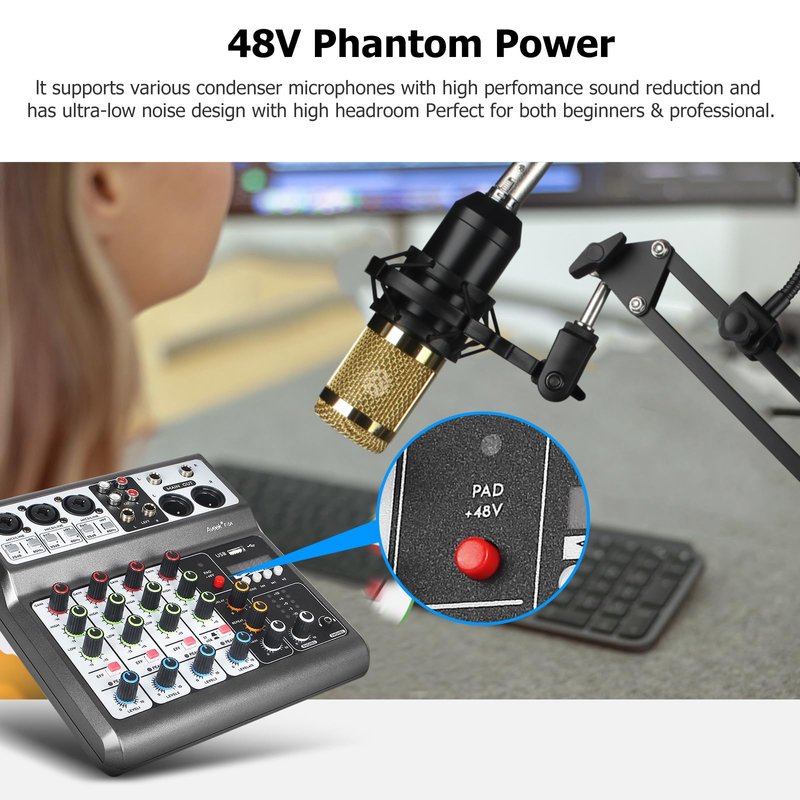 - š¤ć48V Phantom PowerćThe sound mixer have 3 XLR inputs with phantom power.you can feel free to switch 48V phantom power and ultra-low noise distortion enables the audio mixer to be used with condenser microphone.