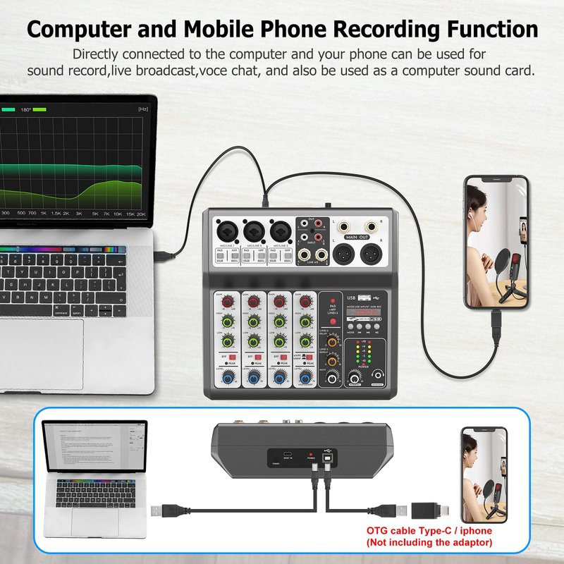 - š¤ćUSB-B Interface for PC/Phone Recording or Playing AudioćThe USB-B jack has a built-in sound card recording transmission processor, so this audio mixer can connect the computer pc,mobile phone,tablets or external USB device to mix and record or play music, Notice: need a USB To Phone OTG Adapter to connect your phone, Because only the OTG Adapter can do data transfer.