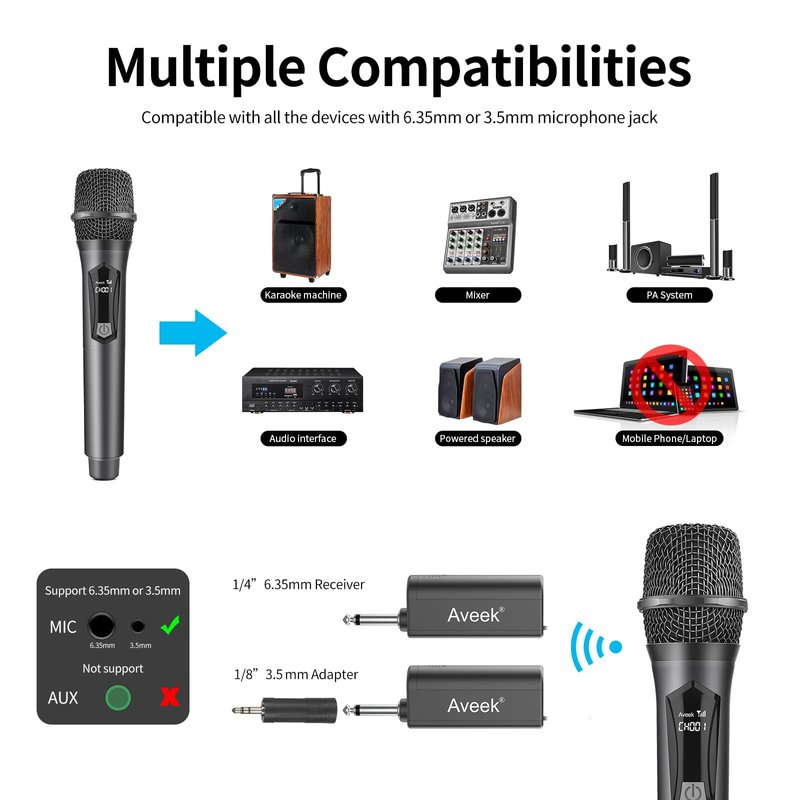 - 🎤Compatibility: With its 6.35mm wireless microphone receiver and 3.5mm converter, excellent signal stability, compatible with Singing Machine,With Mic input Speaker(powered speaker), Audio Amplifier, Pa System, Mixer, Voice Amplifier And More Streaming Multimedia Equipment. NOTE: the wireless microphone system is Not Compatible with Bluetooth Speakers and Laptop, Phones, Computers, Smart tv or Tablets;
