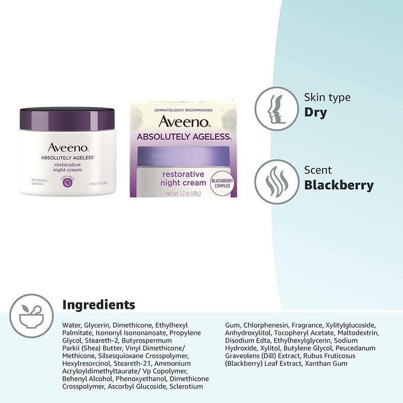 - 1.7-fluid ounce jar of Aveeno Absolutely Ageless Restorative Night Cream works overnight to moisturize and nourish skin