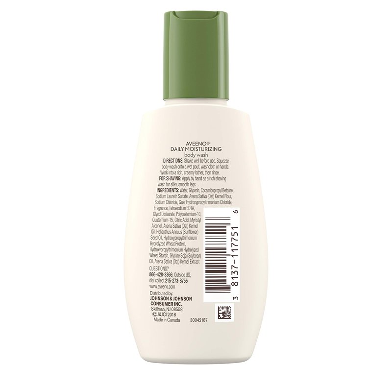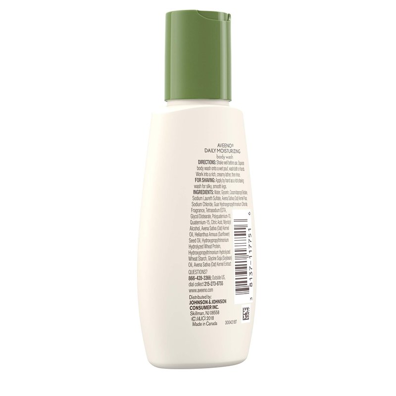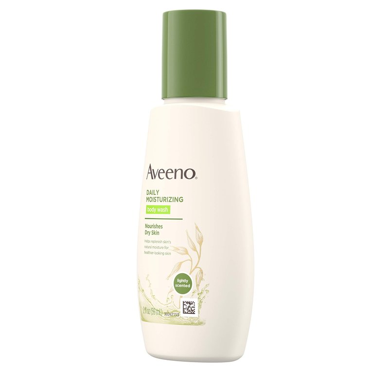 - 2-fluid ounce bottle of Aveeno Daily Moisturizing Body Wash with Nourishing Oat to help replenish skin’s natural moisture