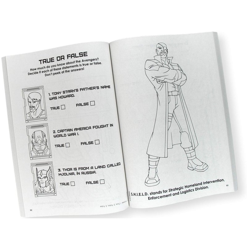 Avengers Coloring Book Set Bundle with Avengers Stickers and Superhero Door Hanger, Full-sized coloring book measures 8.5 x 11.5 inches and has 80 pages. Jam-packed with coloring and activities; mazes, matching, and more! Set has 4-sheet sticker pad with raised stickers featuring all your favorite Avengers. Also includes 5 large stickers. Large stickers measure 2.5 x 2.5 inches. Includes separately licensed superhero pop-art door hanger. 2-sided door hanger lets visitors know if the superhero is "In", or "out saving the world". This coloring book will provide hours of coloring fun and activities!