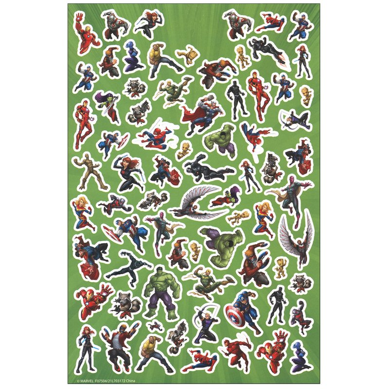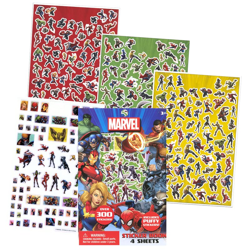 - Set has 4-sheet sticker pad with raised stickers featuring all your favorite Avengers. Also includes 5 large stickers. Large stickers measure 2.5 x 2.5 inches.