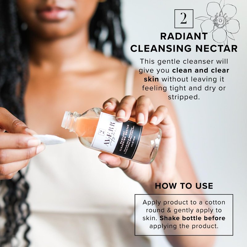 - No.2 Radiant Cleansing Nectar: Transform your skin care with this rinse-free wonder. Specially formulated to eliminate dirt and makeup, it also neutralizes skin impurities. More than a cleanser, it tackles redness & swelling and reduces scars. Ideal for acne-prone skin.