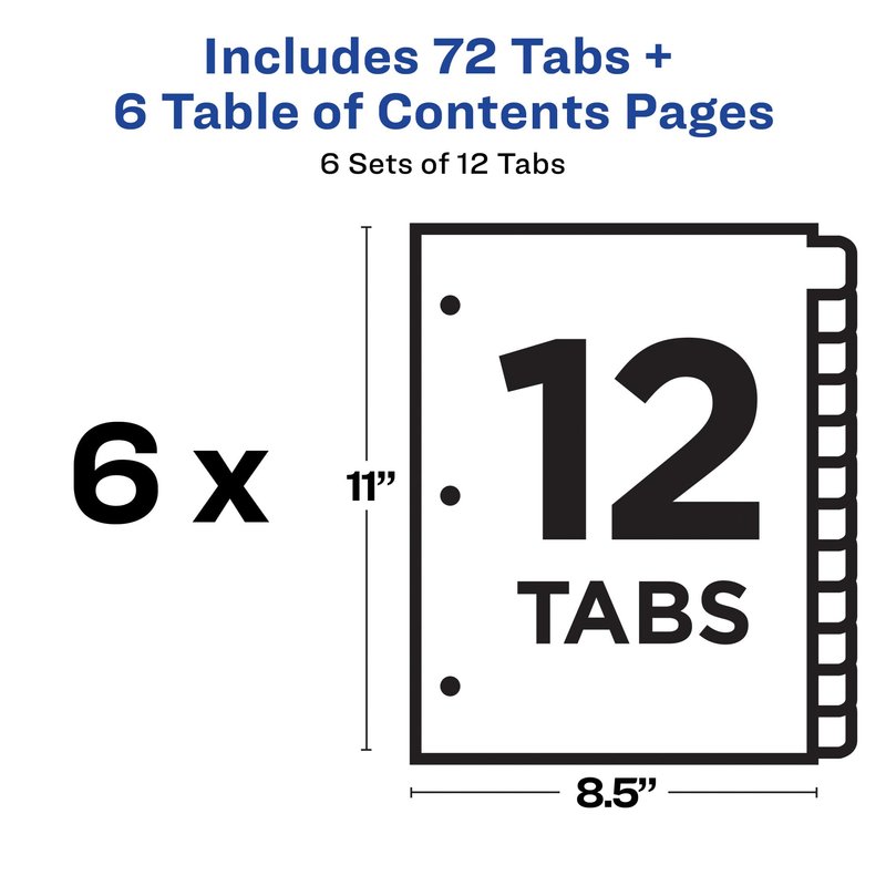 Avery 12 Tab Dividers for 3 Ring Binders, Customizable Table of Contents, Multicolor Tabs, 6 Sets (11196)
