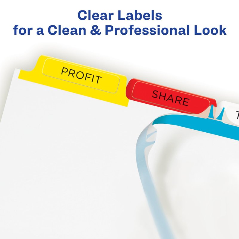 - Get a professional, printed-on look with clear labels that virtually disappear on the multicolor divider tabs
