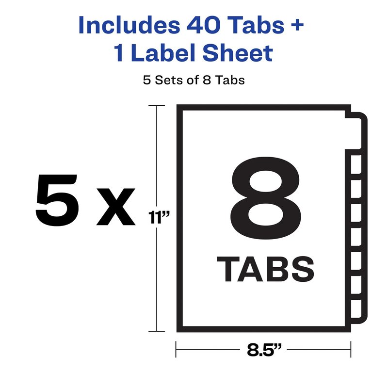 - Label all 8 tab dividers at once with the Index Maker Easy Apply Label strip that results in five perfectly aligned sets of tabs