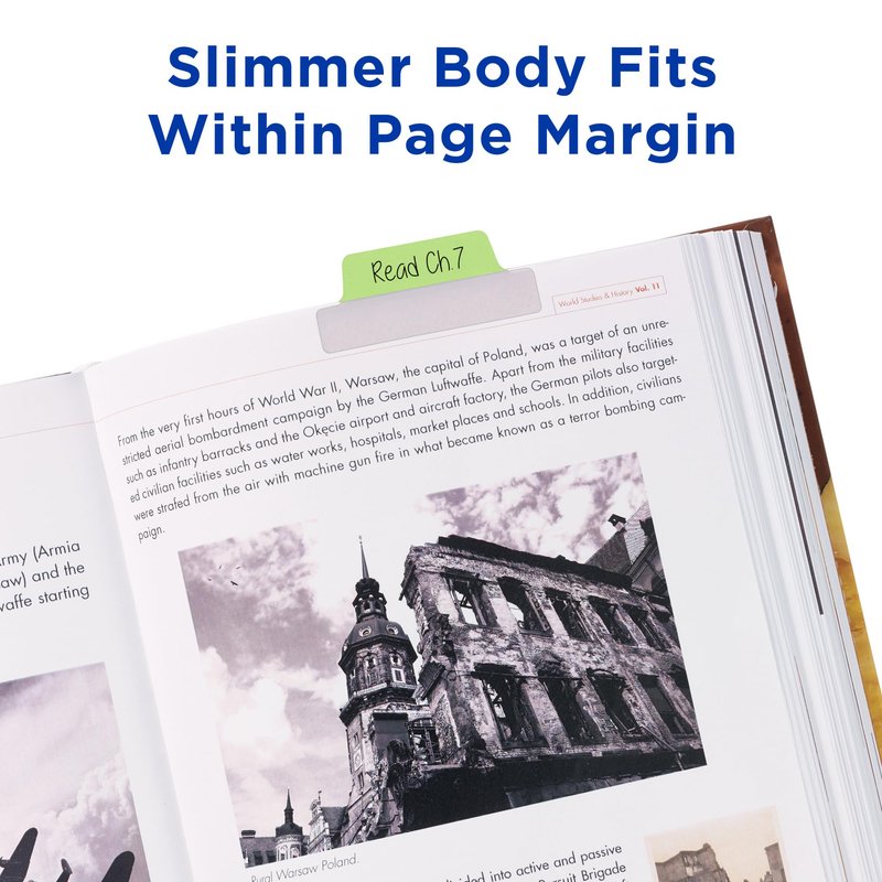 - Mark pages with no interference; the narrow body of the page tab fits perfectly within margins of books, notebooks and documents