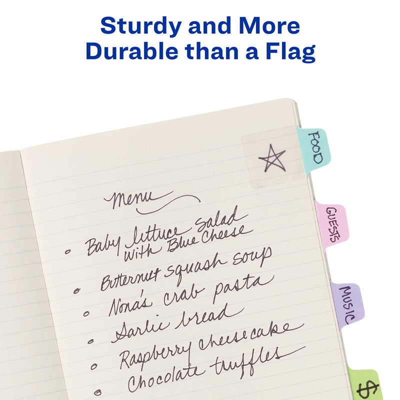 - Easily view underneath the clear page tabs body as you mark cookbooks, color code important documents, decorate planners and more