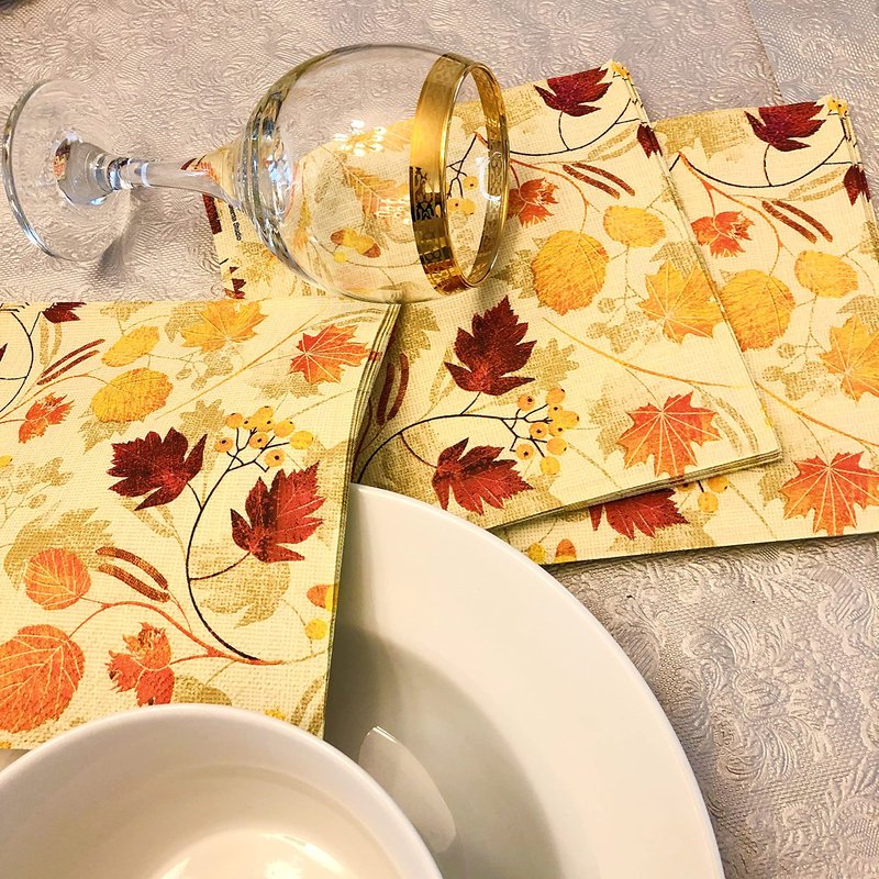 - Fall paper napkins for decoupage make nice décor on your cocktail coffee tables. These fall napkins paper make great gifts to friends, neighbors, teachers, co-workers, sisters, brothers, parents, and grandparents.