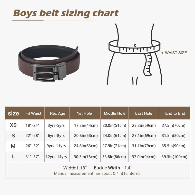 - BELT SIZES : Please measure the waist circumference before purchase boys belt. XS fit waist 18-20", S fit waist 22-24", M fit waist 26-28", The belt is 1.4'' (3.5 cm) wide
