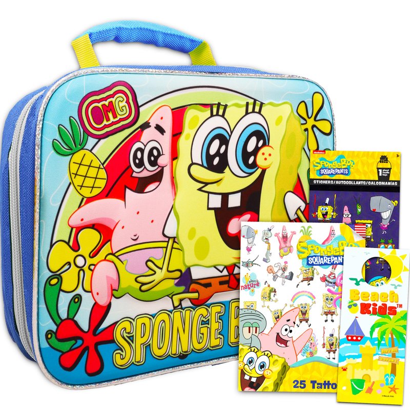 Spongebob Squarepants Lunch Box -- Deluxe Insulated Spongebob Lunch Box with Spongebob Stickers, Stickers, and more. This Spongebob Squarepants lunchbox depicts Spongebob and Patrick. High quality lunch bag features zip closure compartment and a padded carrying handle. Measures approximately 9" x 3" x 8". Perfect for keeping food cold and fresh all day long. The perfect addition to any Spongebob Squarepants backpack. This set includes bonus Spongebob tattoos, Spongebob stickers, and a Beach Kids door hanger! Officially licensed Spongebob Squarepants school supplies for kids -- boys and girls alike.