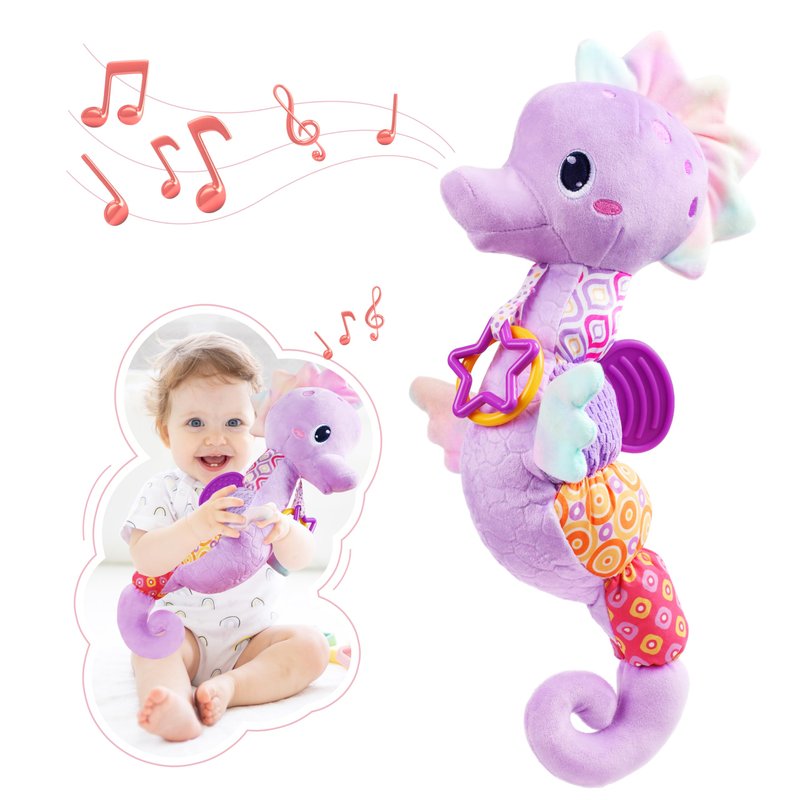 - These vibrant Seahorse newborn toys offers a range of colors, comfortable fabrics, and diverse textures to engage your baby. It promotes visual, tactile, and auditory development, ensuring a comprehensive learning experience. - The adorable baby musical Seahorse produces delightful sounds, including a crinkle rattle and a music box. These stimulating features contribute to auditory development, providing endless fun for your baby girl. -