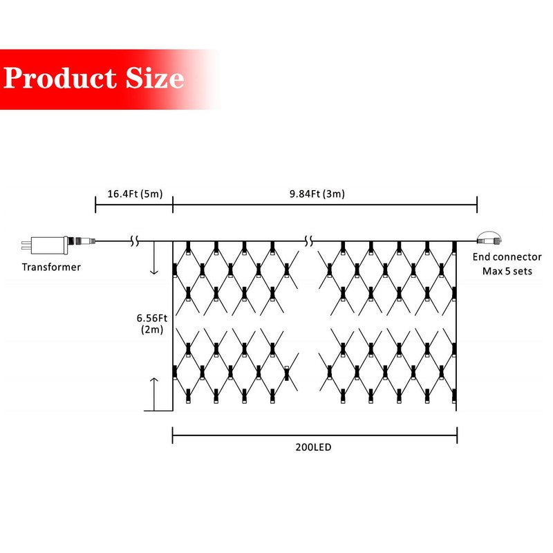 - High Quality: 200 LED 9.8ft x 6.6ft net mesh lights with solid construction plastic material, adapter powered. 30V low voltage string lights with UL 588 certified for safety use. Power line: 16.4ft. light string: 9.8ft x 6.6ft, length totally: 26.2ft approx.