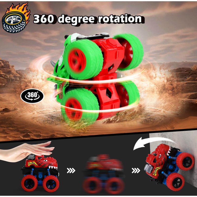 - The First Stunt Cars for Kids: Our dinosaur stunt car is perfect for kids who love adventure and dinosaurs! It can tumble and flip at 360 degrees, which offers a thrilling and unique experience for children. With all-terrain performance,it can easily play anywhere,whether in the living room, park, lawn or garden.