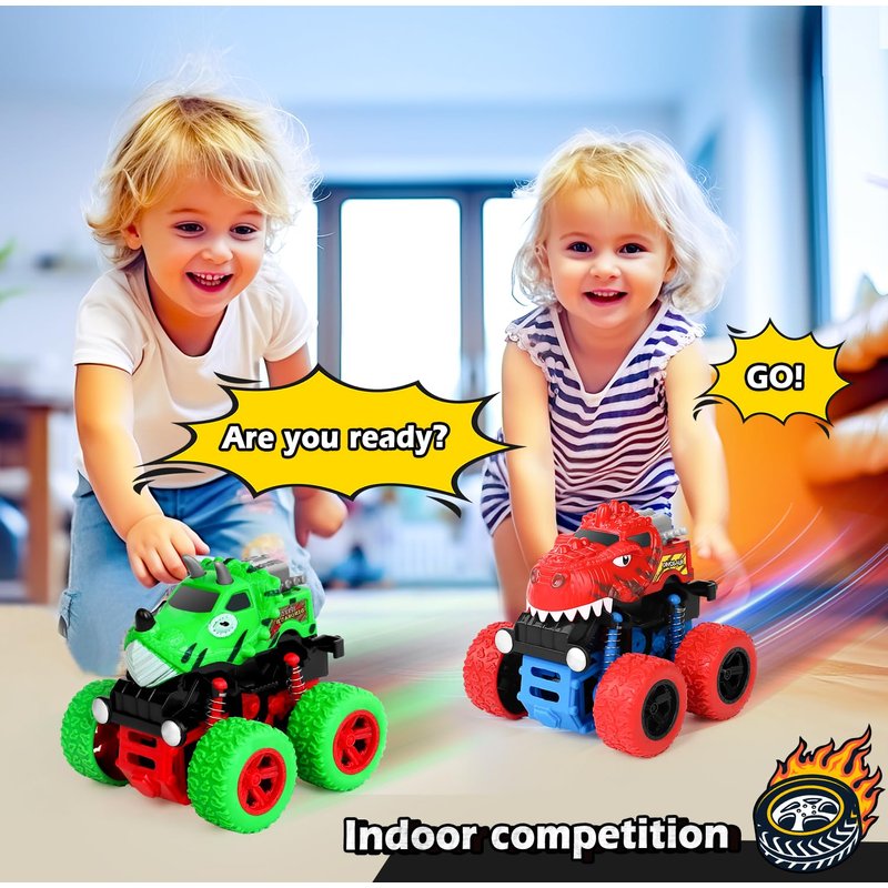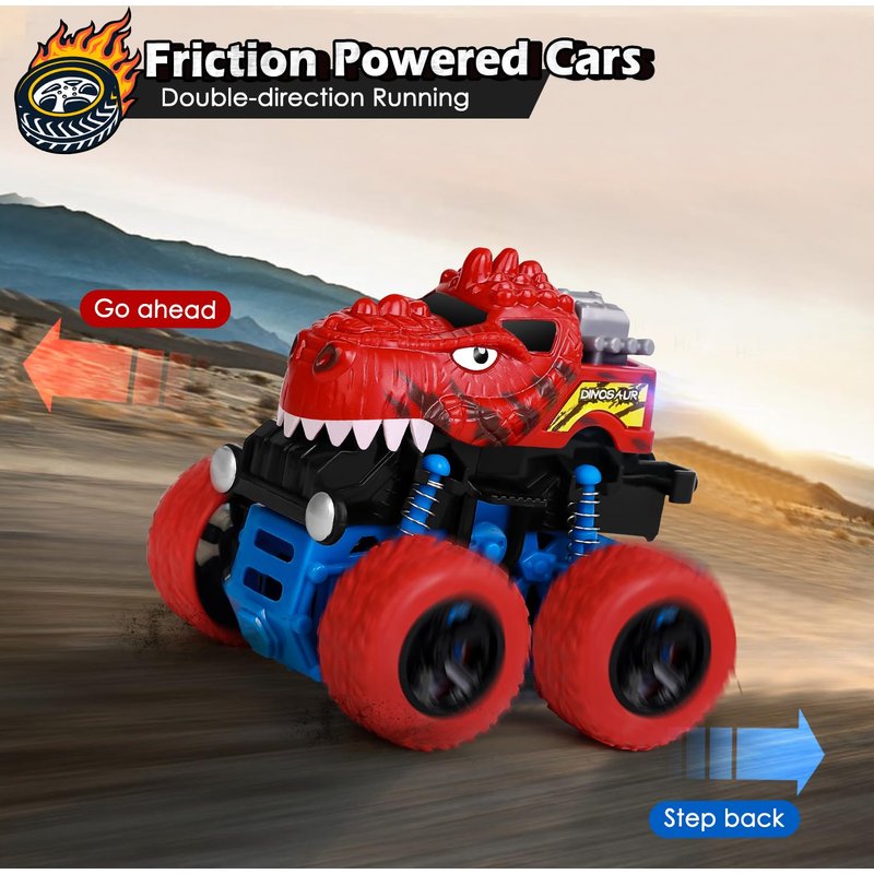 - Push and Go: Double pull back design(4×4 power), battery free, easy to play for preschoolers. This dinosaur trucks can be pushed forward and backward, keeping your child entertained and thrilled for hours.