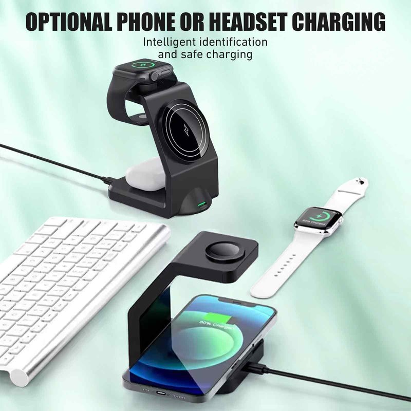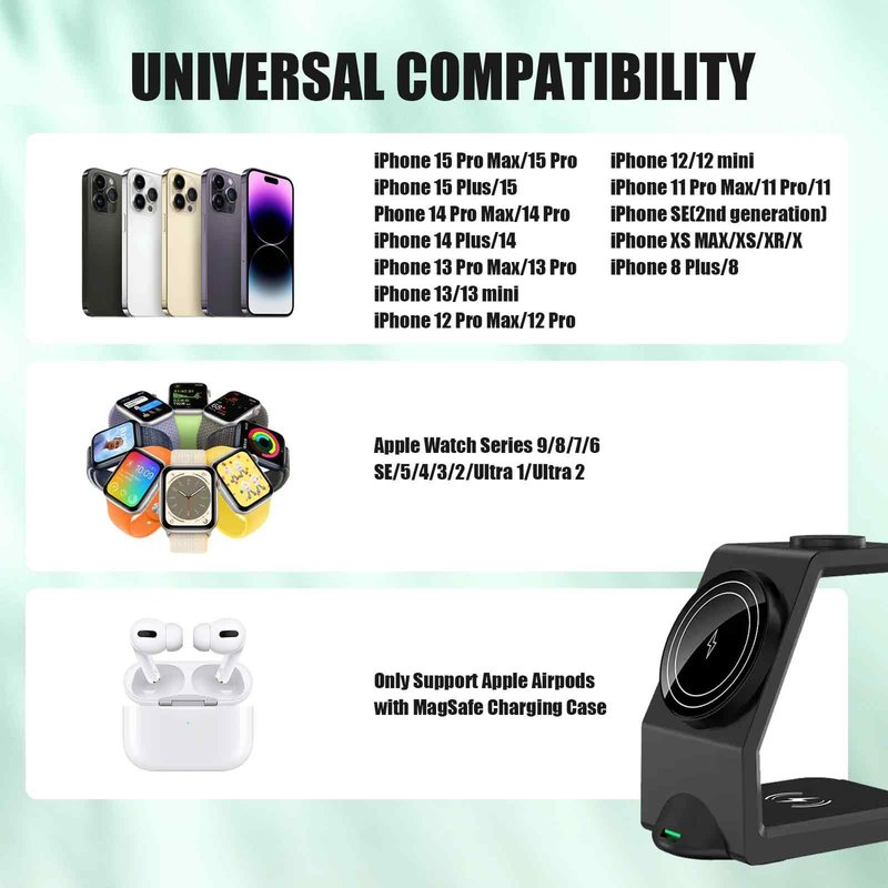 AWUKOMSN 3 in 1 wireless charging station can be used as watch charger,phone wireless charger, and earbuds charger. The efficient chipset provides 15W high-speed charging, temperature control, and voltage protection to ensure safe and stable charging.
