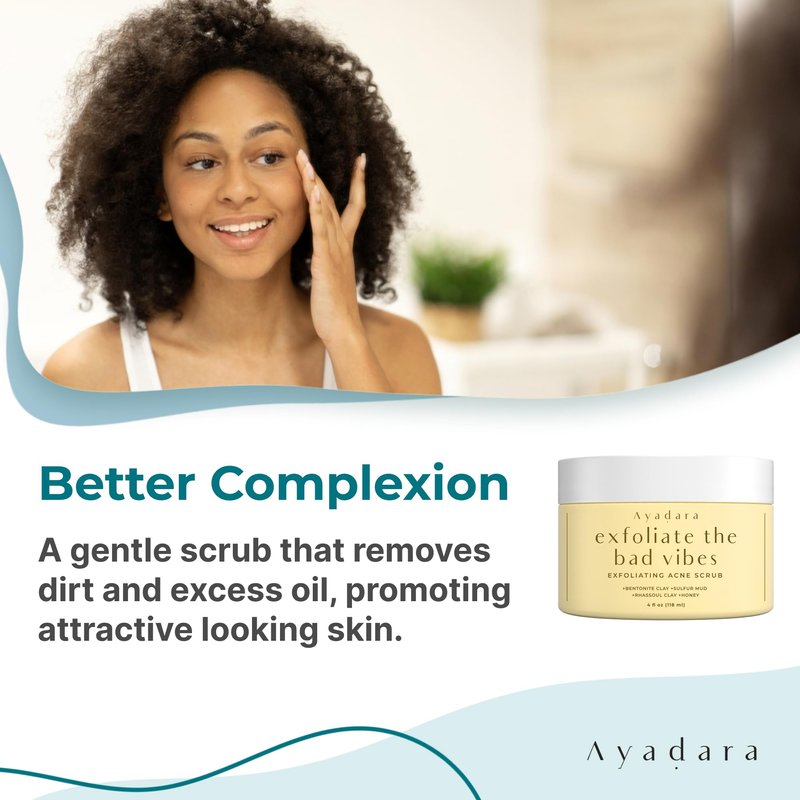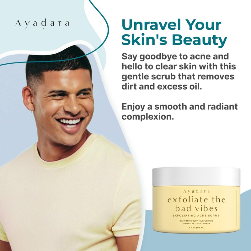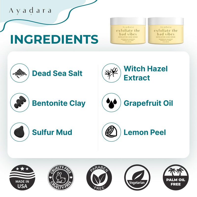 The Ayadara Exfoliate Bad Vibes is an acne scrub face wash that that clarifies, cleanses, and tones the skin. This face scrub for acne prone skin is designed for adults, teens, women, and men and is said to be suitable for all skin types. Our face wash acne works as a blackhead facial scrub, face mask, and pimple spot treatment. The nature-powered formula of our exfoliant scrub draws out impurities from the skin and locks in moisture to smooth pores.