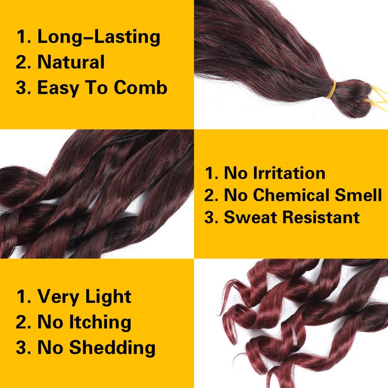 - Hair Material:French curly braiding hair made of High Quality Pre Stretched Flame-Retardan Synthetic Fiber.bouncy loose wavy braiding hair,natural looking super soft as human hair.