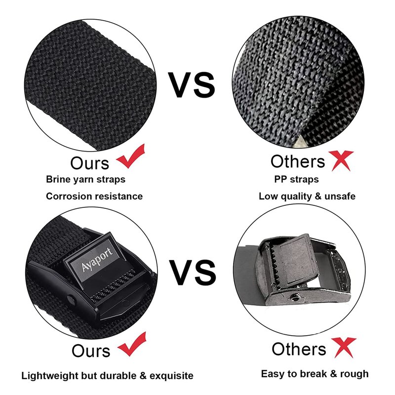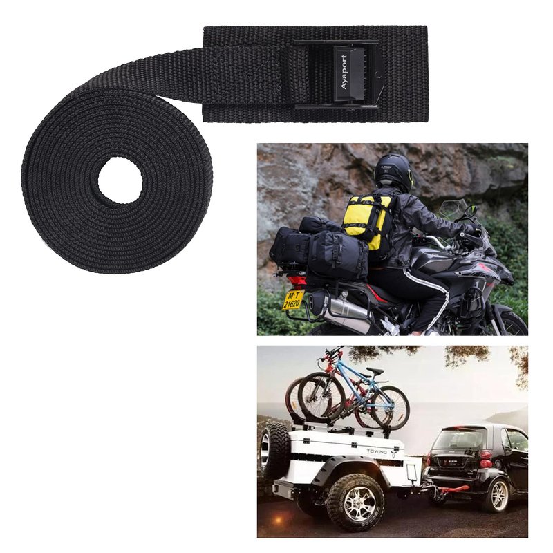 - MULTIPURPOSE. Ayaport cam buckle tie down straps are widely used to securing small or large cargo, luggage, packing, camping gear, household goods etc. Also these Ayaport lashing straps in 8ft or 12ft length can be great car roof rack straps to secure kayak, SUP, surfboard, bicycle or other outdoor sports items. A must have cam buckle tie down straps for every family.