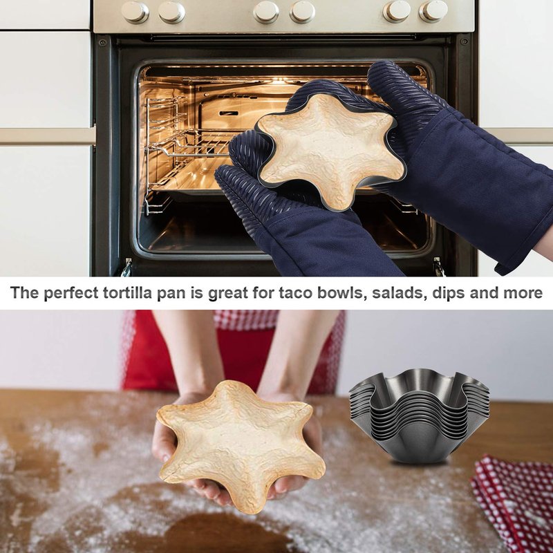 - Packaging Includes: 6 pcs tortilla pans. Ideal for baking crispy, low-fat tortilla bowls and flavorful, lower calorie, low fat, healthy meals without frying. Warm Tip: Please confirm whether the size meets your needs before purchase.
