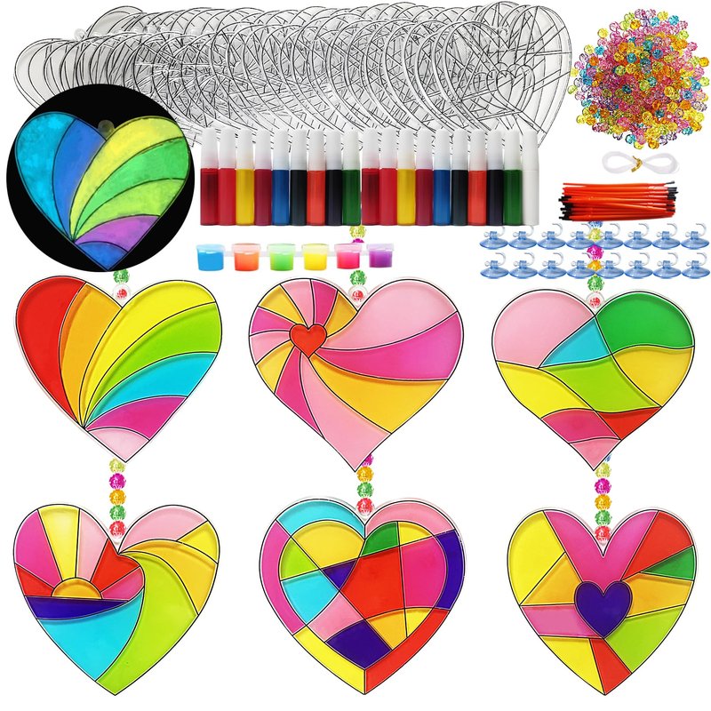 - 30 Sets Valentine's Heart Sun Catcher Kit:30 sets Valentine Suncatcher Craft ornament decoration includes 30 pcs heart sun catchers in 6 designs, 19 bottles of suncatcher paints in 10colors ,30 paintbrushes, 300 pcs acrylic beads, 1 roll of 393" fishing thread,30 pcs suction hooks,complete accessories for easy suncatcher DIY painting.Use our diy window paint art suncatchers to make unique decorations for your home or party.