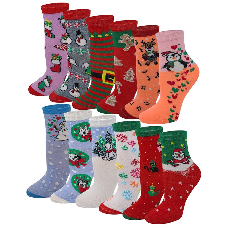 Ayla 12 Pairs Pack Kids Girls Colorful Creative Fun Novelty Design Crew Socks (4-6, Christmas)