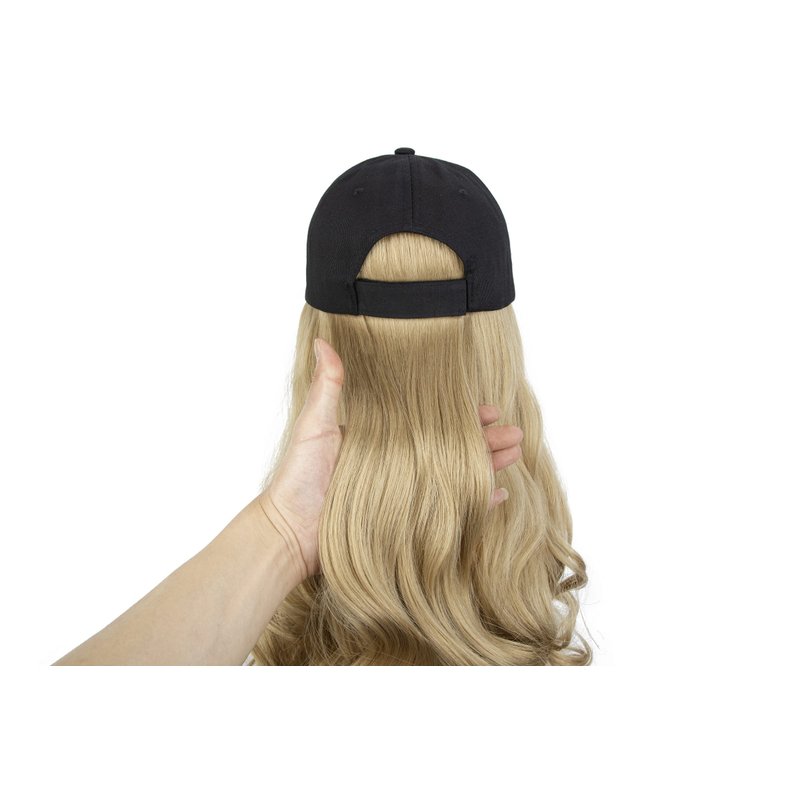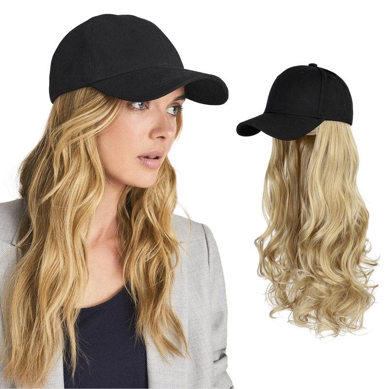 AynnQueen Baseball Cap with Detachable Hair Extensions for Women 21 inch Long Wavy Synthetic Hair with Adjustable Hat Wig Attached Black Baseball Cap (Bleach Blonde)