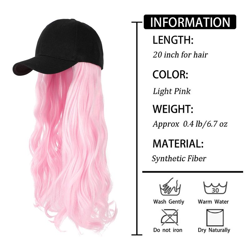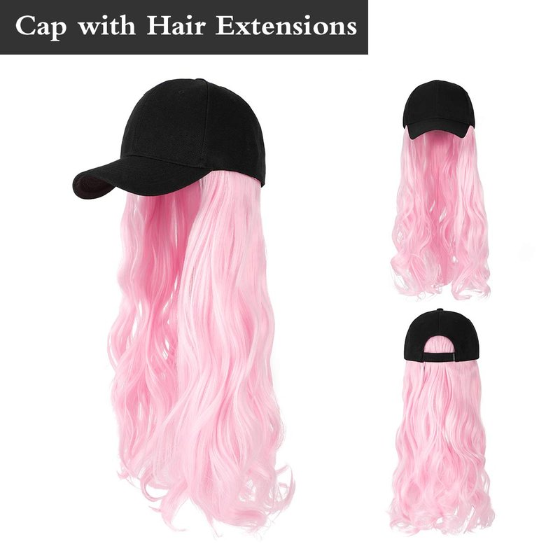 AynnQueen Baseball Cap with Hair Extensions for Women Adjustable Hat with Synthetic Wig Attached 24inch Long Wavy Hair Black Baseball Cap (Light Pink)