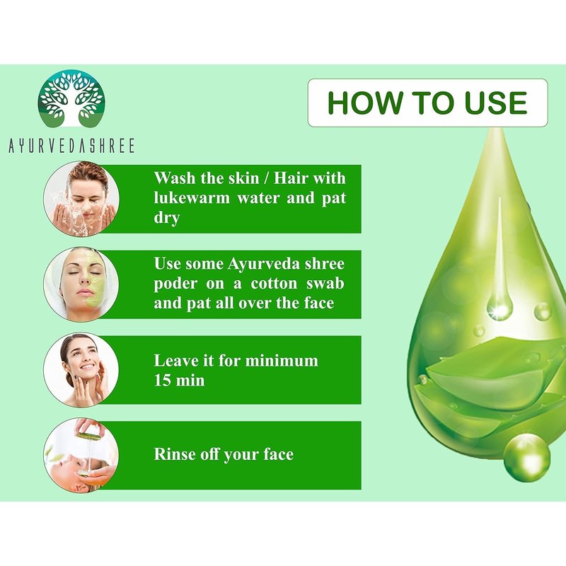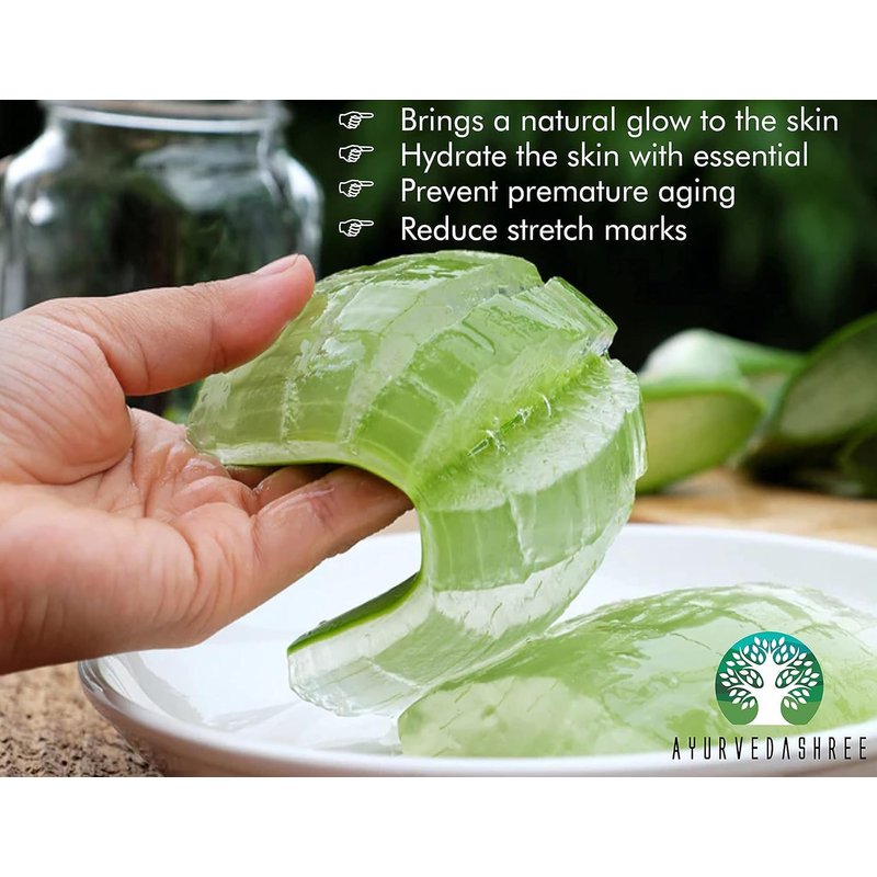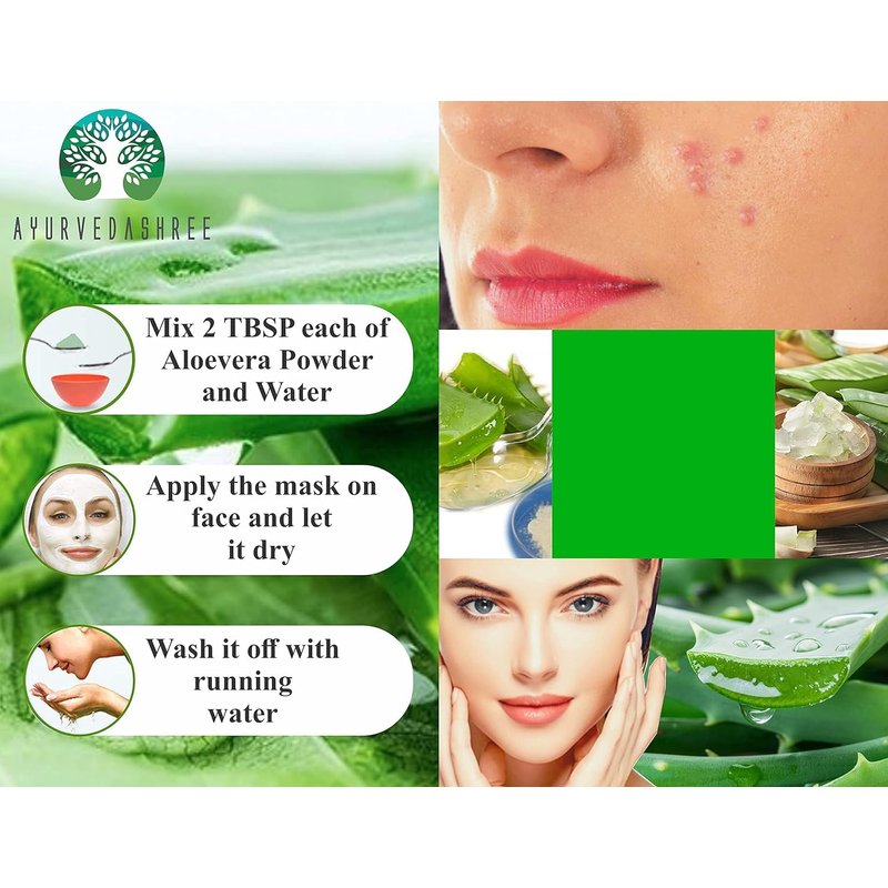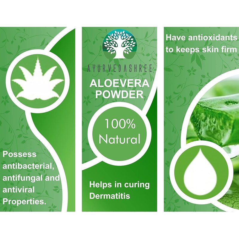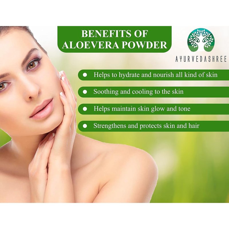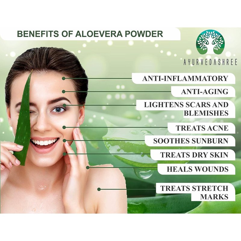 AYURVEDASHREE Aloe Vera is best known for its use as a gentle sunburn treatment, but the truth is that aloe Vera is a very valuable ingredient in many different cosmetic products. Aloe Vera powder treats wounds, dry skin and sun burns, moisturizes the skin, prevents premature aging, & promotes hair growth.