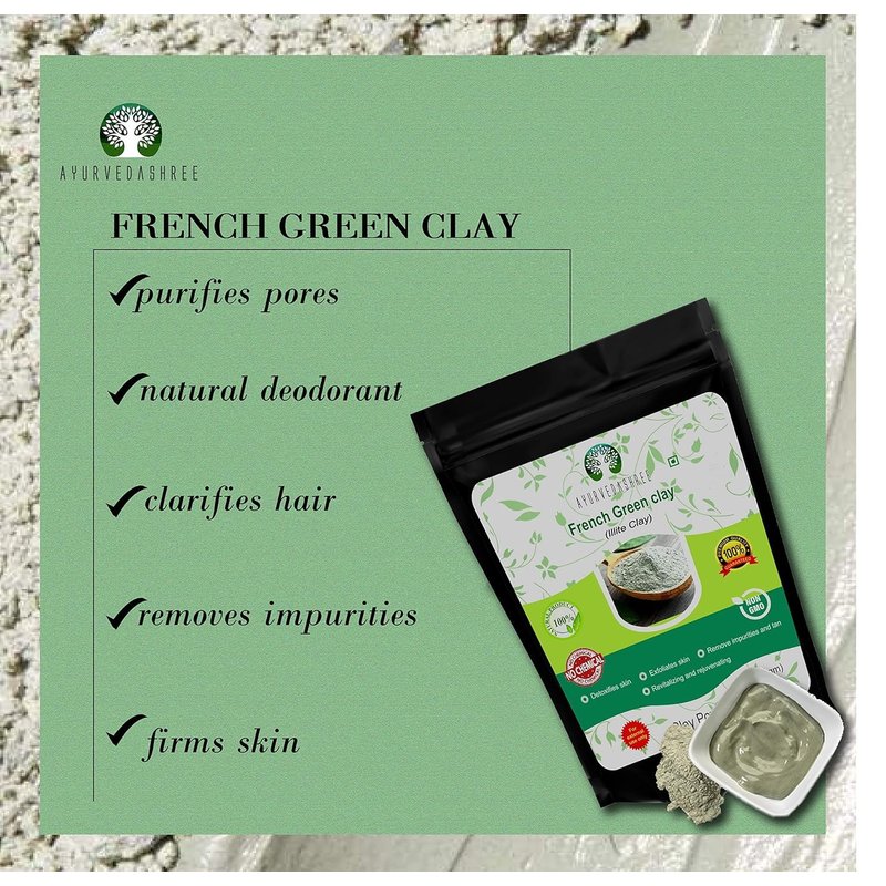 AYURVEDASHREE French green clay is beneficial in removing impurities and tightening the pores, toning the skin, exfoliating dead skin cells and reducing inflammation in acne. It can also be used as a full-body treatment to soften dry, rough skin.