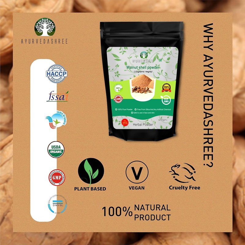 AYURVEDASHREE Walnut Shell Powder 50 Gm. Walnut shell powder is know to be one of the best abrasive and natural solution to cosmetic scrubs. It is made using crushed walnut shells (out skin on walnuts), which are hard, yet soft for using in formulating facial scrubs. Its free from any chemicals. Walnut shell powder is drown from specific sieving method, to get you most suitable mesh (particle size), for cosmetic formulations. It particle size is not so big, that it will bruise you skin, nor so fine that it do not give any exfoliants or scrubbing effect. Its very much safe and easy to use as a cosmetic ingredient in making : Facial scrubs, skin cleansers, peeling creams, exfoliants, foot scrubs and lotions.