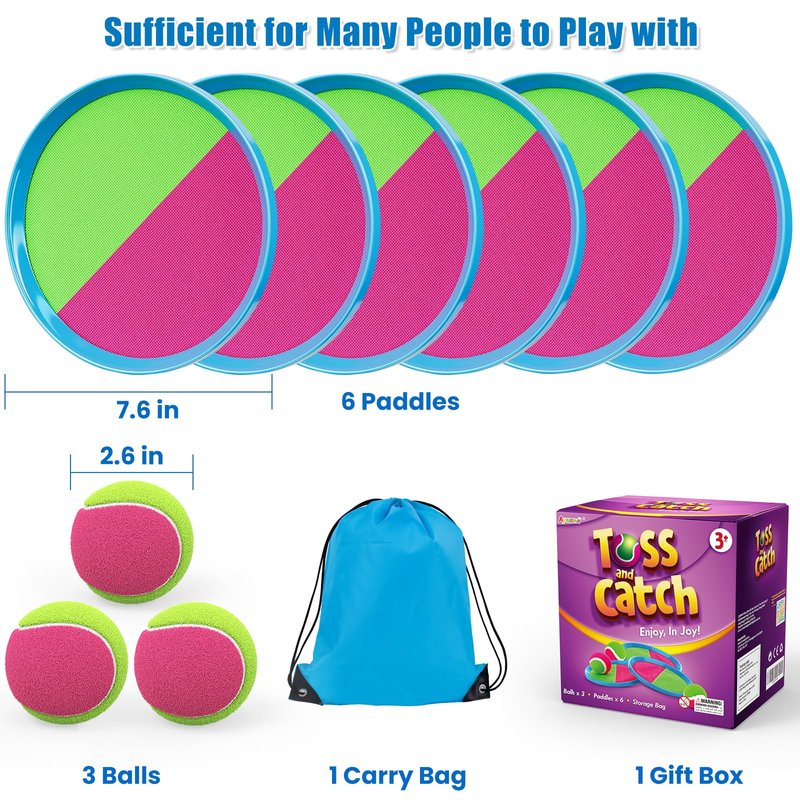 - VERSATILE GAME FOR ALL OCCASIONS: With 6 sticky paddles and 3 balls, this toss and catch game can be played by 2-6 people, making it a fantastic option for family fun. Whether you're at the park, the yard, or the beach, our easter basket stuffers for toddler indoor and outdoor kids games toys will provide hours of entertainment.